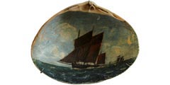 Coquille peinte – Bisquines sous voiles (Gréement de régate) – Coquille de clam – Signature illisible – Très fine œuvre miniature. Circa 1930. |