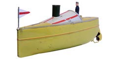 | Bing Bateau de rivière à moteur mécanique à ressort. Schiffe Bing. Destiné au marché Français, il s’appelle Louise, peut être du nom de l’épouse de l’importateur Français de la marque en France. | ||