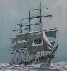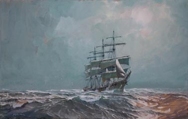 Marin Marie – 1901 /1987 – Marin Marie fut nommé Peintre Officiel de la Marine en 1935 – Quatre mâts barque sous voilure réduite par gros temps – Gouache sur papier - Signé en bas à gauche.