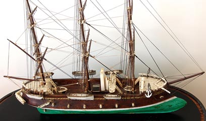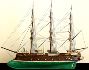 Maquette de cuirassé à éperon. Bâtiment à voiles et vapeur. Trois mâts et hélice. Construction en bois et en ivoire pour de nombreuses pièces. Canons à flanc de muraille, chaloupes, cheminées, superstructures. Coque en bois vernis, sous marine verte.   Circa 1880. Maquette ancienne de bateau – Bâtiment de guerre. – Cuirassé à éperon
